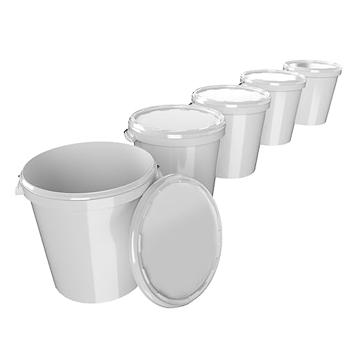 FixedByU 5 hinkar med lock 30 liter tillverkad i Tyskland – livsmedelssäker stabil lufttät behållare för förvaring av mat kontorsmaterial barnrum hushåll verkstad och gastronomi vit
