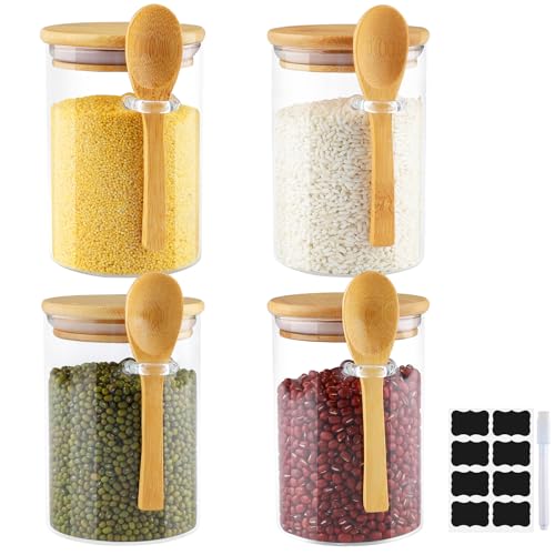 Mezzar Förvaringsburkar med lock och sked, set om 4 500 ml glasbehållare för förvaring av torrprodukter, kryddor, te, nötter, frön, nudlar, mjöl, kaffebönor