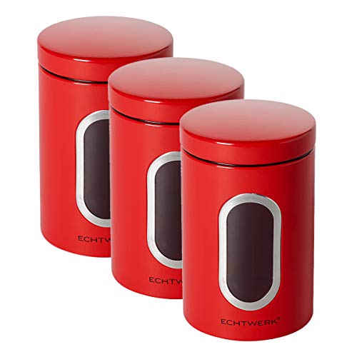 ECHTWERK snygga förvaringsburkar set om 3 röda, för förvaring av mjöl/socker/müsli/te, metallburk med lufttätt lock och stort fönster, kapacitet 1, 4 l, järn, 3