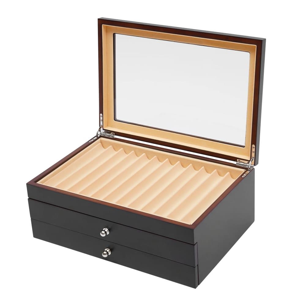 Displaylåda för pennor - Förvaringsbox - 34 fack - Trä - Sammetsfodrad insida - För reservoar-, kulspets- och markerpennor