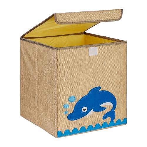Relaxdays Förvaringsbox, Delfinmotiv, tyglåda för barn, vikbar, HBT: 33 x 33 x 33 cm, leksakslåda, beige/blå