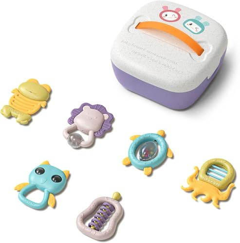 TUMAMA Baby skallra leksaker 6 st spädbarn bitringar skakare, ta tag och snurra skallror, set med musikleksaker med förvaringsbox tidig pedagogisk, leksaksgåvor för 0, 3, 6, 9 12 månader, bebisar