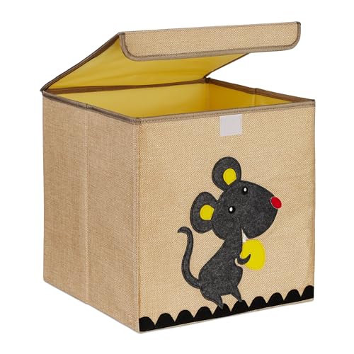 Relaxdays Förvaringsbox, musmotiv, tyglåda för barn, vikbar, HBT: 33 x 33 x 33 cm, leksakslåda, beige/grå