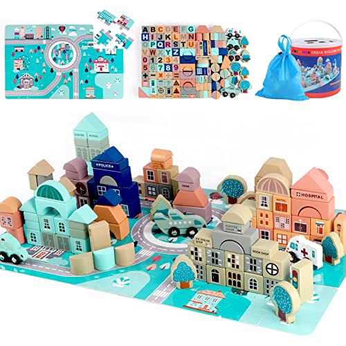 jacootoys 133 stycken stad pedagogiska byggklossar i trä leksaker i förvaringsbox med formsorteringsspel för 3-6 år, barn, pojkar, flickor