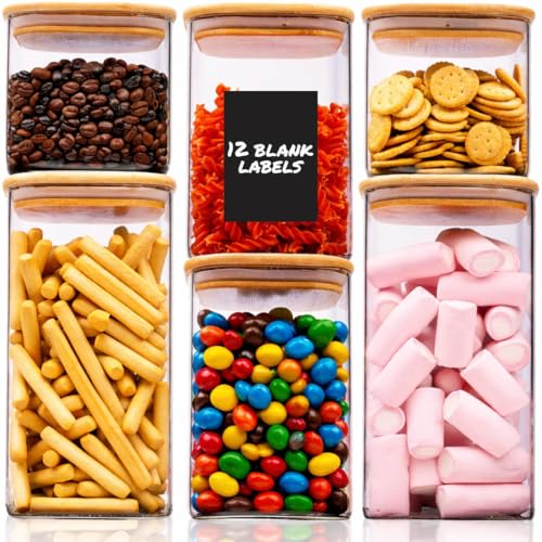 Withosent Förvaringsburkar glas set om 12, fyrkantiga kryddburkar, trälock 430/600 ml, glasbehållare med lock, förvaringsburkar, kök för kryddor, te