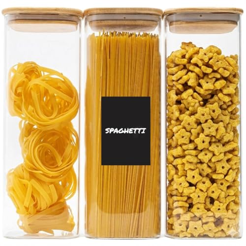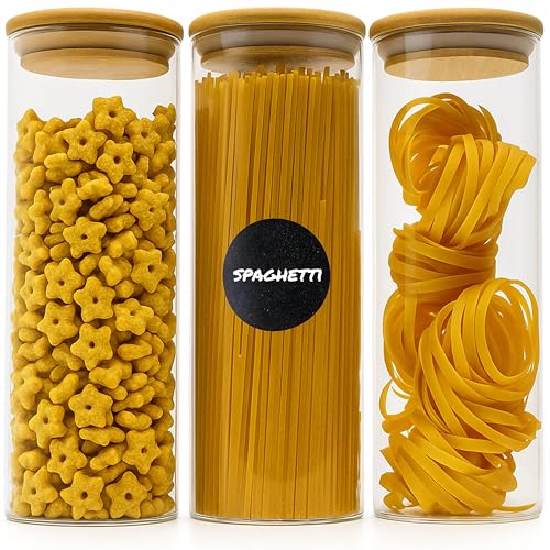 Deco Haus® Förvaringsglas med Lock För Spaghetti, 3-set 2300ml + Etiketter [LUFTTÄT] - För Müsli, Cornflakes, Mjöl - Förvaringsburkar i Glas med Lock - Förvaringslåda Kök - Förvaringsglas