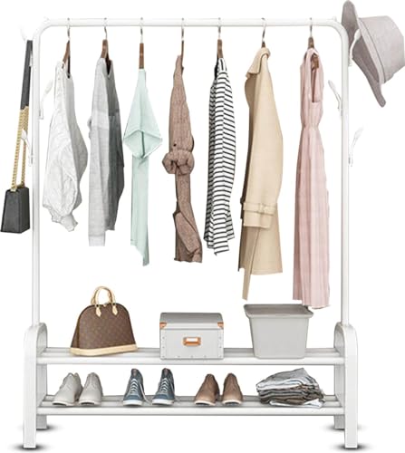 Vonia Klädställning med Hjul – Dubbelt Klädställ med Skohylla i Metall – Flyttbar Garderob med Klädstång och Förvaringshylla – 159x34x98 cm – Metallisk - Vit