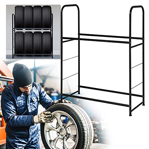 Aufun Däckhylla, höjdjusterbar, förvaringshylla, fälghylla, 2-våningar, galvaniserad metall, verkstadshylla för 8 däck svart, 107 x 46 x 117 cm