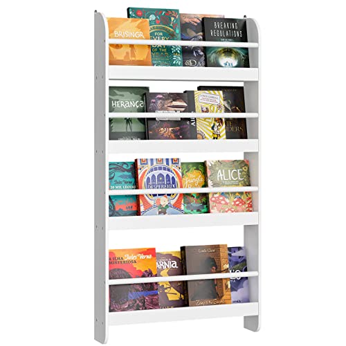 FOREHILL Bokhylla barn, vägghylla med 4 hyllor, barnhylla för böcker leksaker, hängande hylla, dekorativ hylla för barnrum, läshörna, förvaringshylla av trä, HBT: 111 x 58 x 12 cm, vit