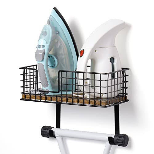YBING strykbräda hängare väggmonterad järnhållare med förvaringshylla och trä bas korg metall strykbräda hållare med hylla och krokar för tvättstuga (svart)
