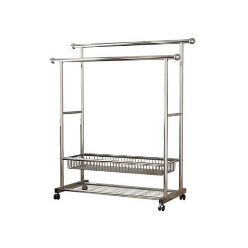 Dubbelstång Klädställ på hjul Kraftig metall Klädställ med förvaringskorg & bottenhylla Silver Krom Klädställ för skor Hattar Jackor Kappor