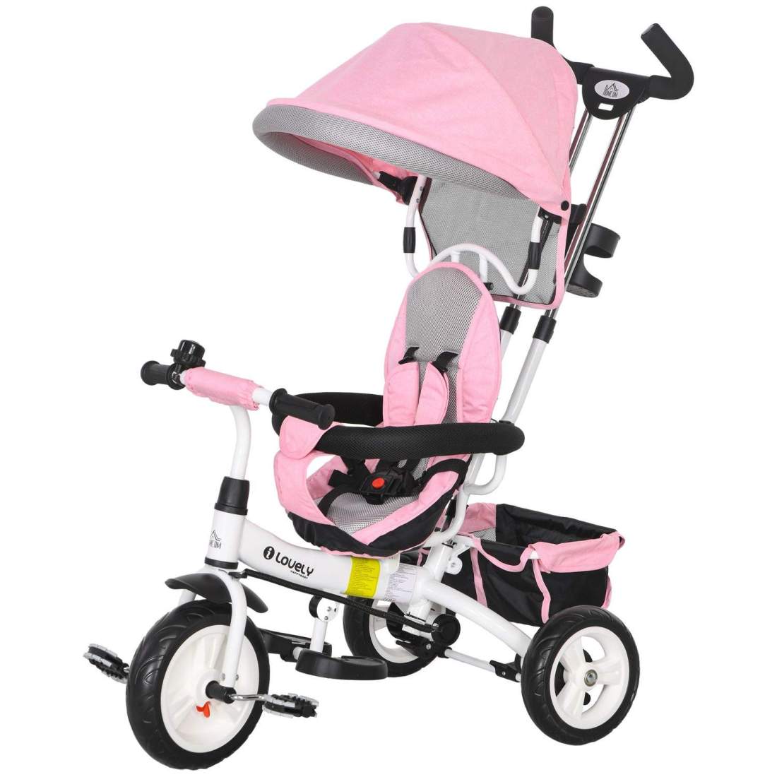 6-i-1 barntrehjuling med körbygel, tak, bälte, förvaringskorg, för 1-5 år, rosa
