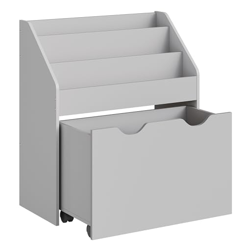 WOLTU Bokhylla för barn, MDF-bokhylla, förvaringslåda med 3 fack och 4 inre hjul, grå och vit KR004