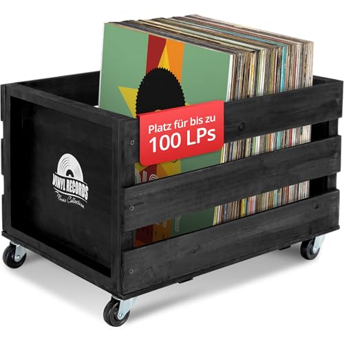 Stagecaptain SPK-100 BK LP-skivask "Emil" – förvaringslåda för upp till 100 LP:ar – tillverkat av massivt trä i retrodesign – 4 styrbara hjul – kan även användas för många andra upp till 25 kg –