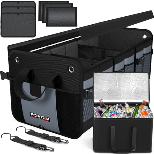 FORTEM Hopfällbar Bagagelåda för Bil – Förvaringslåda med Flera Fack, Halkfri Botten, Justerbara Spännen & Vikbart Lock – Organisera Baklucka och Bagageutrymme (Svart, 3 Fack Med Kylare)
