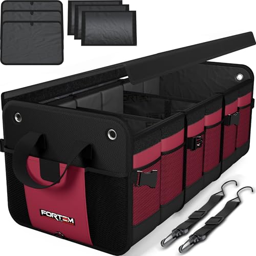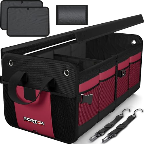FORTEM Hopfällbar Bagagelåda för Bil – Förvaringslåda med Flera Fack, Halkfri Botten, Justerbara Spännen & Vikbart Lock – Organisera Baklucka och Bagageutrymme (2 Fack, Röd)