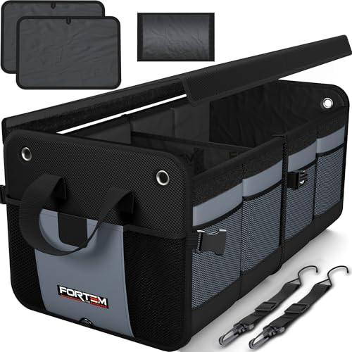 FORTEM Hopfällbar Bagagelåda för Bil – Förvaringslåda med Flera Fack, Halkfri Botten, Justerbara Spännen & Vikbart Lock – Organisera Baklucka och Bagageutrymme (2 Fack, Grå)