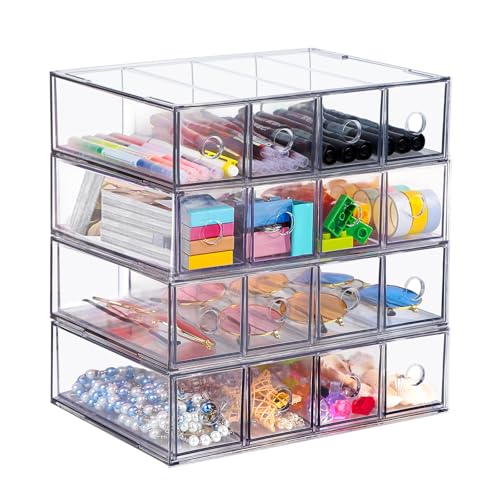 Supaway 4 stycken Förvaringslåda med 16 fack Stapelbar Låda Skrivbord Organisatör med Avtagbar Låda Multifunktionell Förvaringslåda för brevpapper, Mark, Kontor, Solglasögon