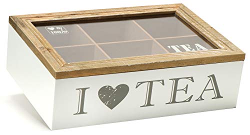 COM-FOUR® förvaringslåda för tepåsar - vit tepåselåda i trä med lock - telåda med 6 fack och glasfönster (1 st - vit/brun/grå)