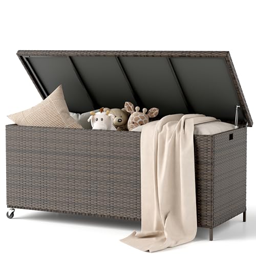 Amopatio Trädgårdslåda, förvaringslåda, vattentät, 480 liter, kuddlåda, utomhus, tillverkad av polyrotting förvaringslåda, metall med hjul och gasfjädrar, trädgårdslåda, väderbeständig för trädgård