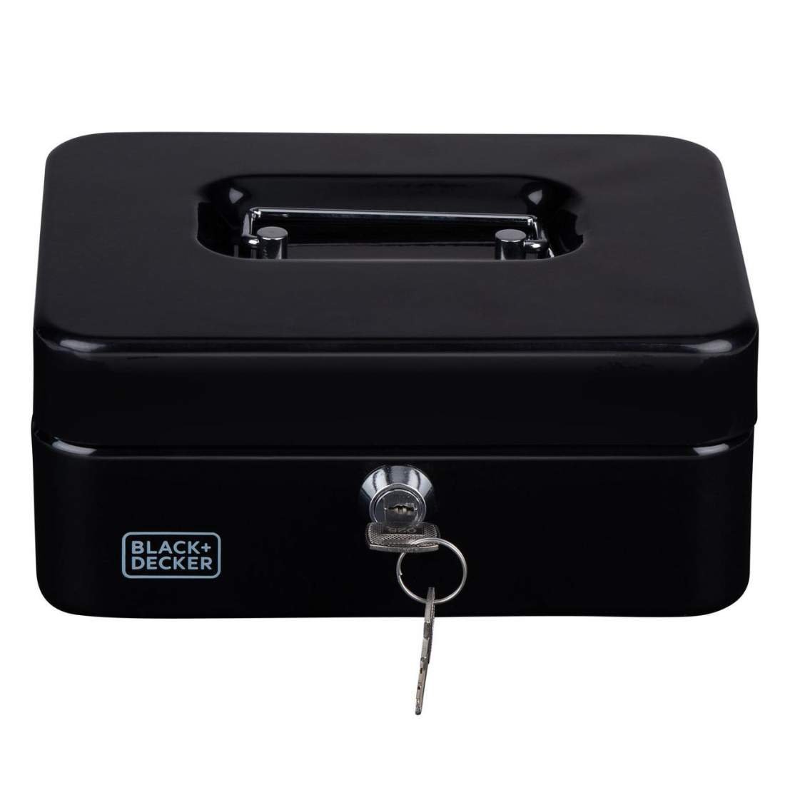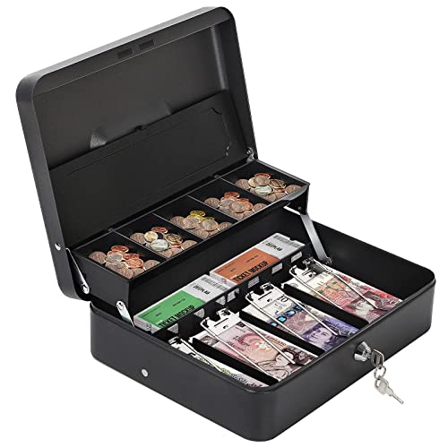 HAITRAL Kassaskåp i metall med nyckellås, Kontantlåda, Förvaringslåda för sedlar och mynt, bärbar stort dubbelskikt 100% säker kassalåda med 2 nycklar – 30 x 24 x 9 cm, svart