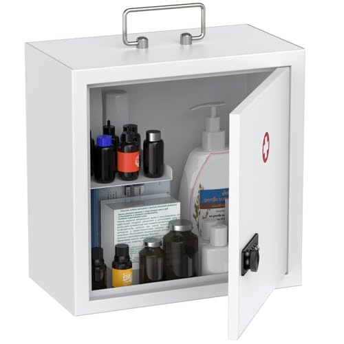Uniclife Väggmonterat medicinskåp med nyckellåsning första hjälpen låsbar medicinsk säker förvaringslåda stor kapacitet medicin organisering säker stål väggskåp metall förvaringsbox, vit