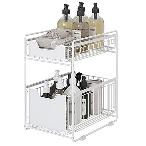 CarolynDesign Förvaringslåda under diskbänken för kök och badrum, glidande förvaringskorg i metall, skrivbord utdragbar förvaringskorg för hem och kontor, vit beläggning
