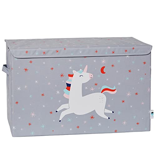 LOVE IT STORE IT Leksakslåda med lock – förvaringslåda stor av tyg – förstärkt med trä – robust och stabil – grå med enhörning – 62 x 38 x 39 cm