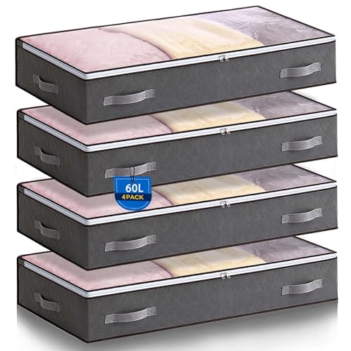 Boic 4-pack 60 l undersängsförvaring, hopfällbara förvaringspåsar under sängen, förvaringslåda med lock, förvaringslådor för underbädd, klädförvaringsväskor med förstärkt handtag för kläder, täcken