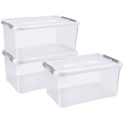 SUNDIS Clip'N Store 27l, set med 3 förvaringslådor i transparent plast, förstärkt med clip-on lock, lämplig för matkontakt, raka väggar, stapelbar och kombinerbar