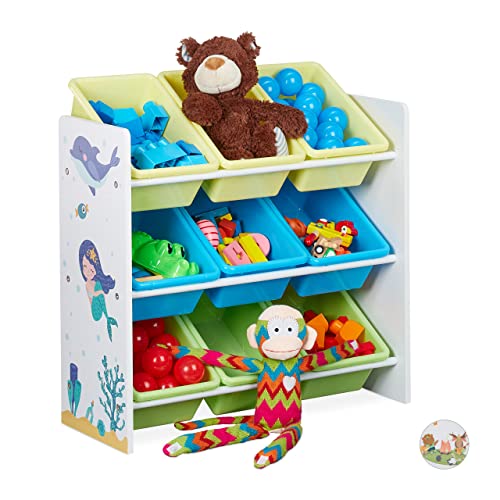 Relaxdays Barnhylla, 9 förvaringslådor, sjöjungfrumotiv, MDF, plast, leksakshylla HBT 67 x 65 x 31,5 cm, flerfärgad