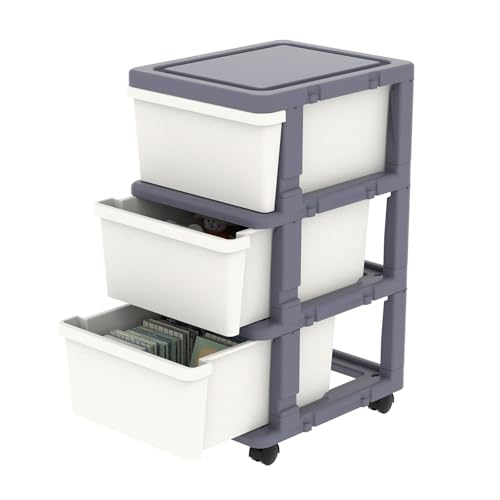 Cetomo Förvaringslådor i plast, förvaringslåda på låshjul, torn med sammankopplade krokar för hemmakontor garderob sovrum sovsal, avtagbar, gratis kombination, vit och grå, 3 lådor
