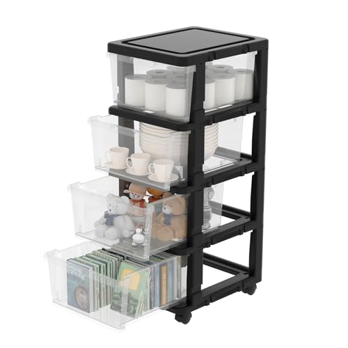 Cetomo Förvaringslådor i plast, förvaringslåda på låshjul, torn med sammankopplade krokar för hem kontor garderob sovrum sovsal, avtagbar, gratis kombination, klar och svart, 4 lådor