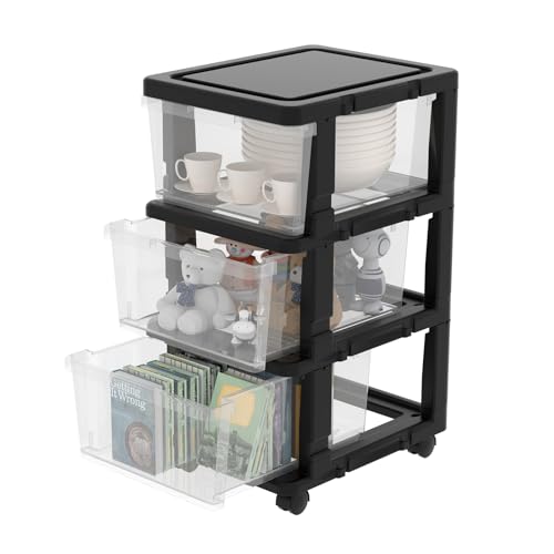 Cetomo Förvaringslådor i plast, förvaringslåda på låshjul, torn med sammankopplade krokar för hem kontor garderob sovrum sovsal, avtagbar, gratis kombination, klar och svart, 3 lådor