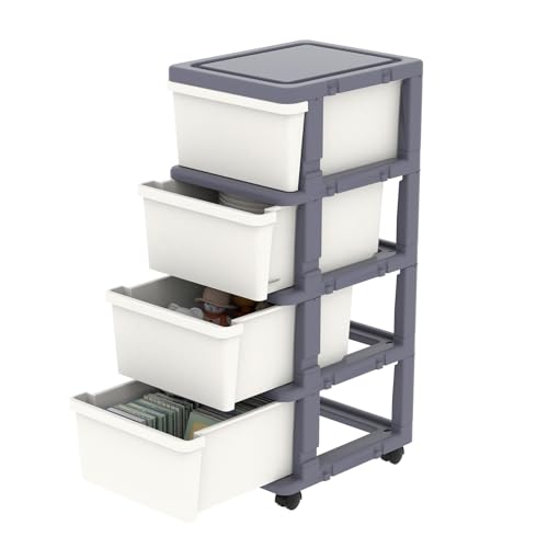 Cetomo Förvaringslådor i plast, förvaringslåda på låshjul, torn med sammankopplade krokar för hemmakontor garderob sovrum sovsal, avtagbar, gratis kombination, vit och grå, 4 lådor
