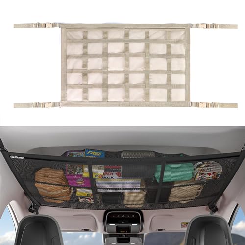 CCAIPU Bil tak last förvaring nätficka, justerbart dubbelskikt nät förvaring nät bil tak organiserare lång resa tak förvaringsnät för bil, SUV, skåpbil (beige, 90 x 65 cm)