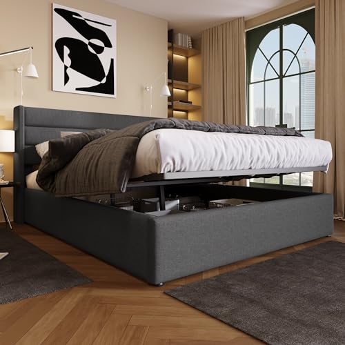 Aunvla Förvaringssäng, klädselsäng, hydraulisk dubbelsäng, 160 x 200 cm, ribbotten av trä, säng med ribbotten av metallram, linne, grå