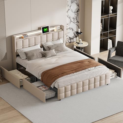 Säng 180 x 200 cm med LED-belysning, dubbelsäng, vadderad dubbelsäng med 4 lådor, USB-laddningsfunktion, sänggavel, förvaringssäng, vuxen med lameller, sängram i linne, beige