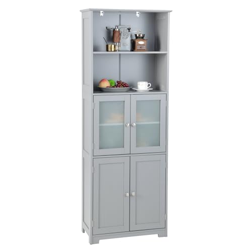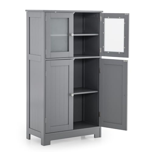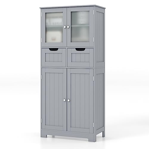 GOPLUS badrumsskåp med hyllor och skåp, högskåp med glasdörrar och justerbara hyllor, badrumsbyrå, förvaringsskåp för vardagsrum, badrum och kök (grå)