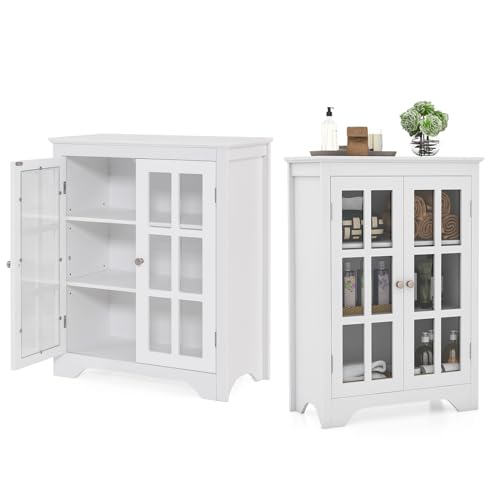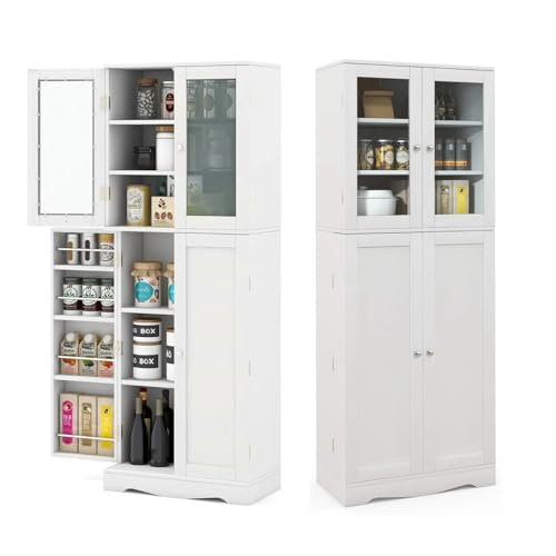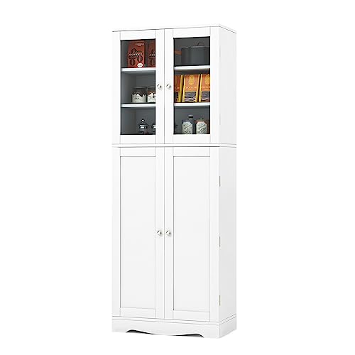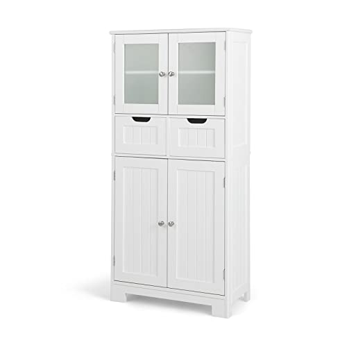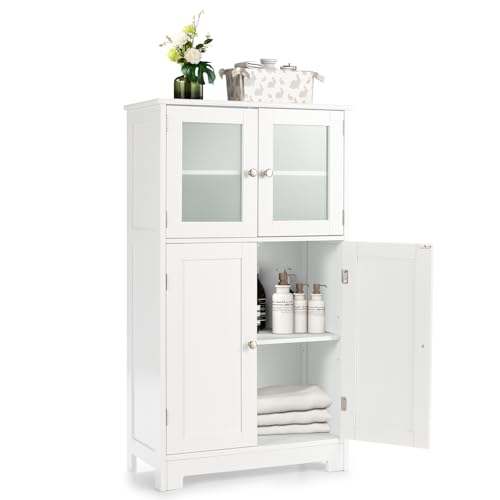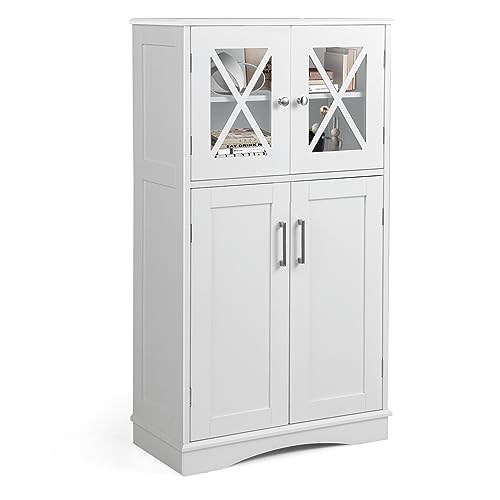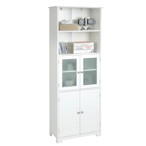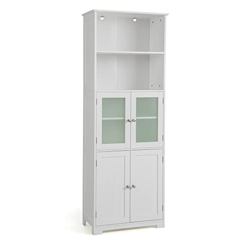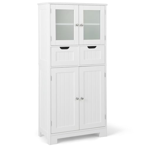 GOPLUS badrumsskåp med hyllor och skåp, högskåp med glasdörrar och justerbara hyllor, badrumsbyrå förvaringsskåp för vardagsrum, badrum och kök (vit)