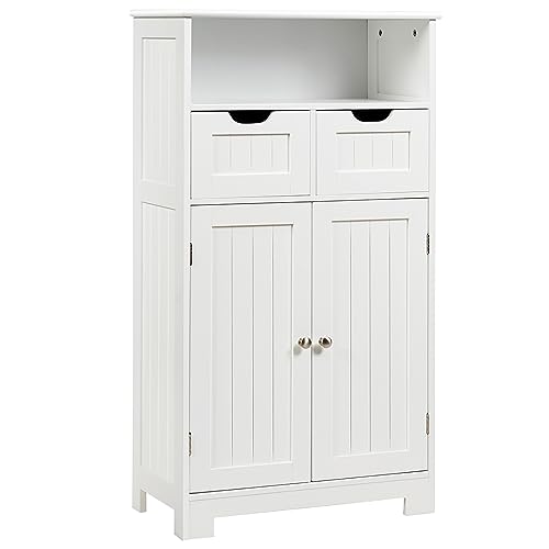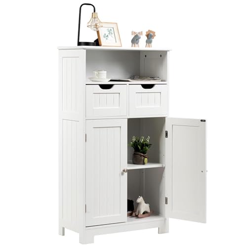 COSTWAY badrumsskåp, med 2 lådor, öppet fack och justerbar hylla, badrumsskåp, högskåp, trä, badrumsbyrå, förvaringsskåp för badrum, kök, vardagsrum (vit)
