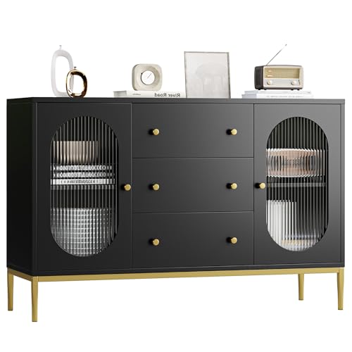 FirFurd Bred sideboard, 120 cm, köksskåp med 2 glasdörrar och 3 lådor, tv-skåp, bufféskåp i trä, förvaringsskåp till kök/vardagsrum/matrum, 120 x 38 x 80 cm, svart