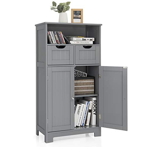COSTWAY Badskåp med 2 lådor och 4 dörrar, badrumsskåp med justerbara hyllor, badrumsbyrå förvaringsskåp för badrum, kök, vardagsrum (grå)
