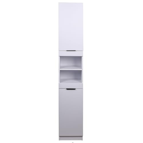 Shally Dogan Rymdbesparande högpelarskåp 2 dörrar och 2 hyllor, fristående smalt skåp, multifunktionell förvaringsskåp, vardagsrum, badrum, kök, bokhylla, kontor (vit)