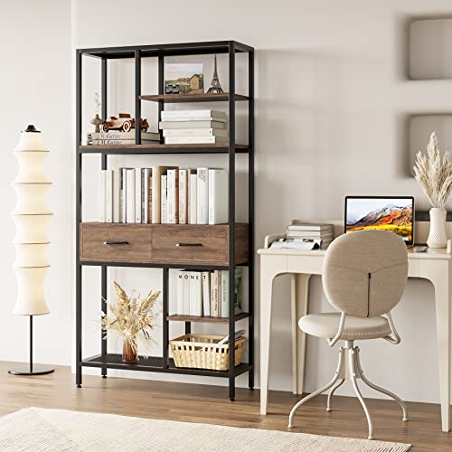 HOCSOK Bokhylla, bokhylla med 5 nivåer med metallram och 2 lådor, träbokhylla förvaringsskåp för kontor, studie, hall, kök