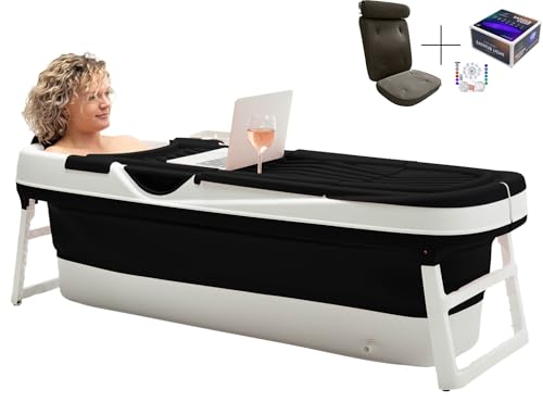 HelloBath® Hopfällbart Badkar XXL 157x60x48 cm för Vuxna | Portabelt Badkar med Badkudde, Förvaringsväska, LED-lampa & Massagevalsar | Mobilt för Dusch & Utomhusbruk | Svart