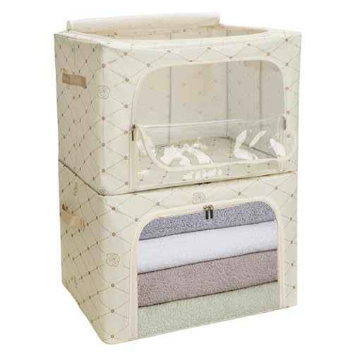 Cozary 66 l förvaringslåda med lock, 2 stycken, förvaringsväska för täcken med dragkedja, metallram, stabil vikbar klädförvaring låda för kläder, tyglåda med handtag och fönster