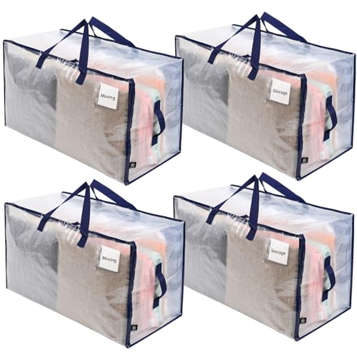 VENO 4-pack kraftig överdimensionerad stor förvaringsväska organiserare med dragkedja och etikettficka för flyttning, klädförvaring, tvättväska, packning, huslösningar, hållbar, vattentålig (klar,