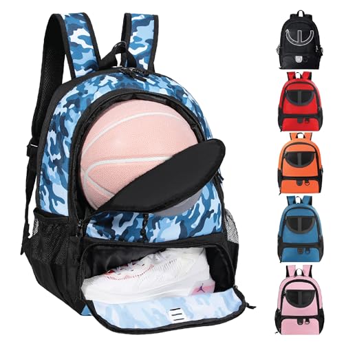 Basketväska ryggsäck för kvinnor män med boll och skor fack 30 L kapacitet lätt andningsbar pojkar flickor fotboll boll väska ryggsäck passform volleyboll fotboll sport resa skola gym blå kamouflage
