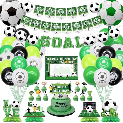 Fotboll födelsedagsfest tillbehör - inklusive Happy Birthday banderoll, fotbollselement flaggväv, bordsuppsatser, gör-det-själv namn hängande skylt, tårtdekorationer, ballonger, för